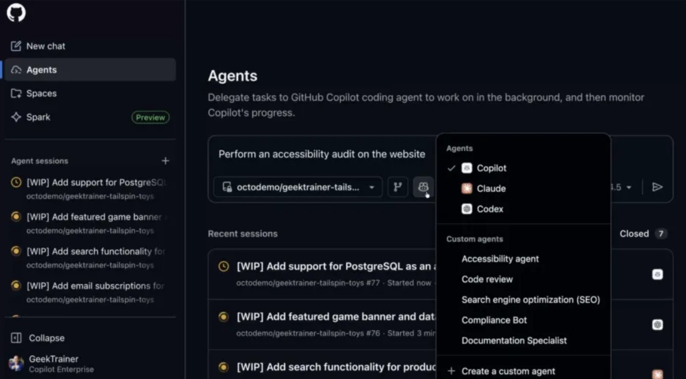 Розробники тепер можуть запускати сеанси агентів та призначати роботу цим агентам з GitHub.com, мобільного застосунку GitHub Mobile та редактора VS Code. Це можна робити безпосередньо із задач, пул-реквестів, вкладки «Агенти» в увімкнених репозиторіях та сеансів агентів у VS Code.