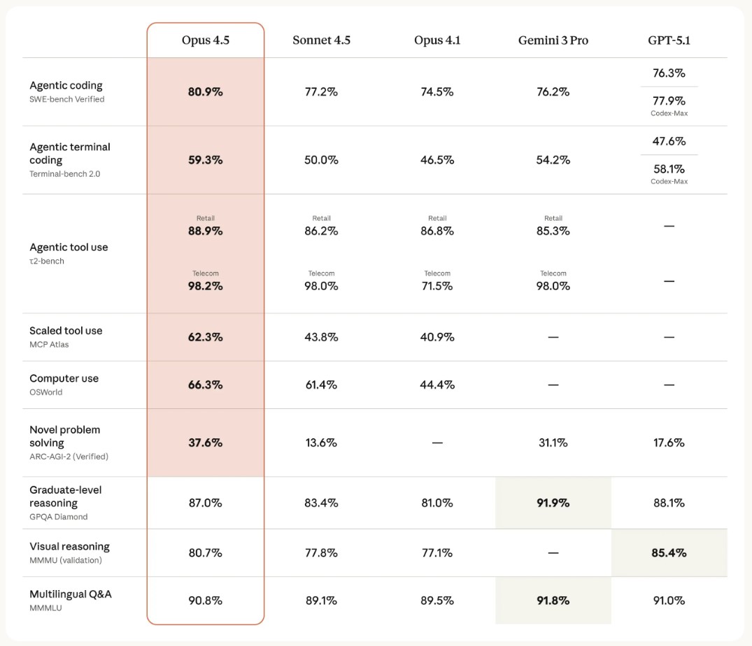 У бенчмарках Claude Opus 4.5 перевершує усі інші моделі-конкуренти, в тому числі нещодавно представлені Gemini 3 Pro, GPT-5.1 та спеціалізовану модель кодування під назвою Codex Max, яка може працювати автономно протягом тривалого часу. Нова модель від Anthropic досягла 80,9% у SWE-bench Verified — бенчмарку, що вимірює реальні завдання програмної інженерії, перевершивши OpenAI GPT-5.1-Codex-Max (77,9%), Sonnet 4.5 (77,2%) та Google Gemini 3 Pro (76,2%), згідно з даними компанії.