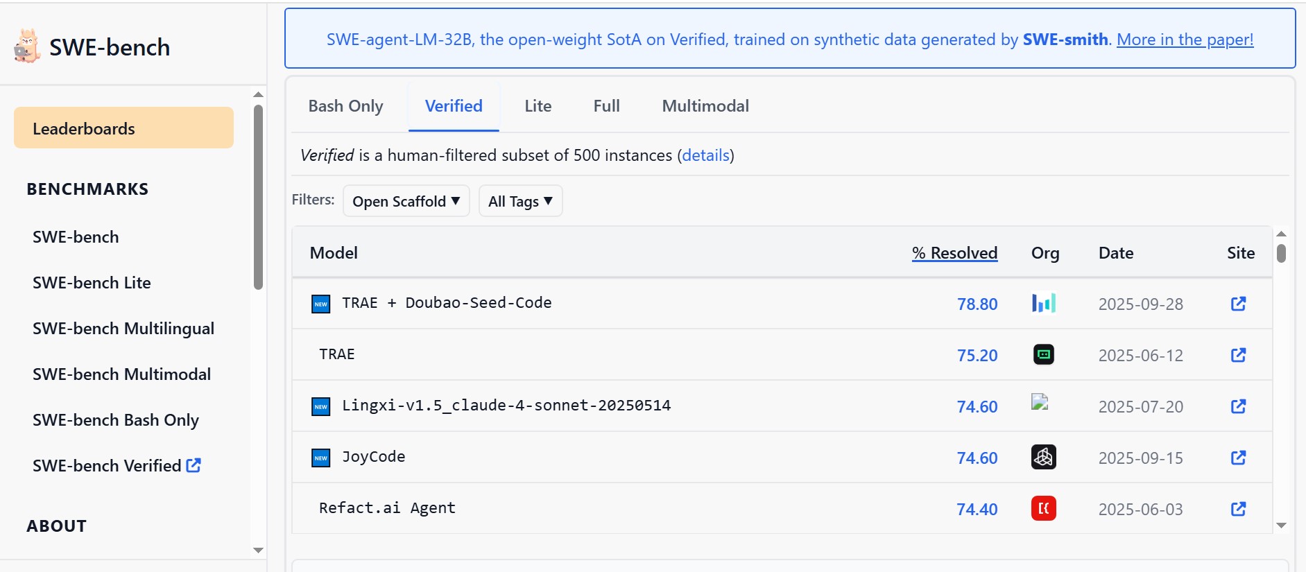 За результатами SWE-Bench Verified новий агент набрав 78,8% — це можна порівняти з рівнем з Claude Sonnet 4.5 від компанії Anthropic. За інформацією Volcano Engine, Doubao-Seed-Code вже інтегровано у сінгапурський додаток для кодування Trae.