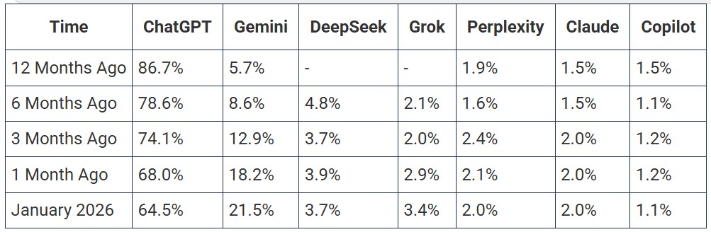Згідно нового звіту компанії з веб-аналітики SimilarWeb, на початку січня 2026 року частка ChatGPT впала до 65%. Роком раніше чат-бот OpenAI був беззаперечним лідером з часткою 86% користувачів.