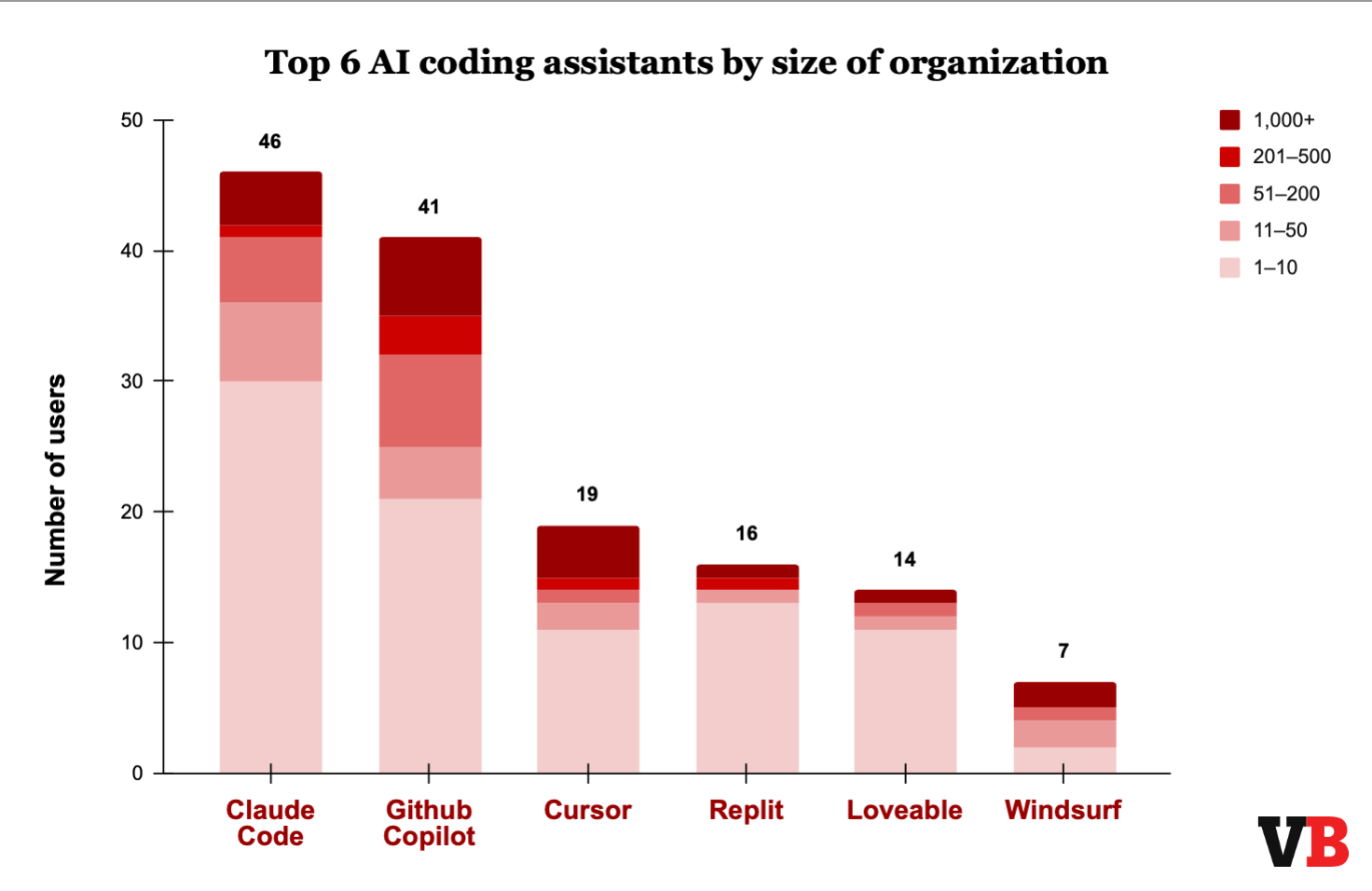 Опитування, проведене Venture Beat серед 86 команд розробників, виявило, що GitHub Copilot домінує у впровадженні на підприємствах (82% серед великих компаній), тоді як інструмент Claude Code від Anthropic лідирує за загальним впровадженням (53%). Replit і Loveable демонструють значно нижчий рівень корпоративного використання, незважаючи на свою технічну перевагу.
