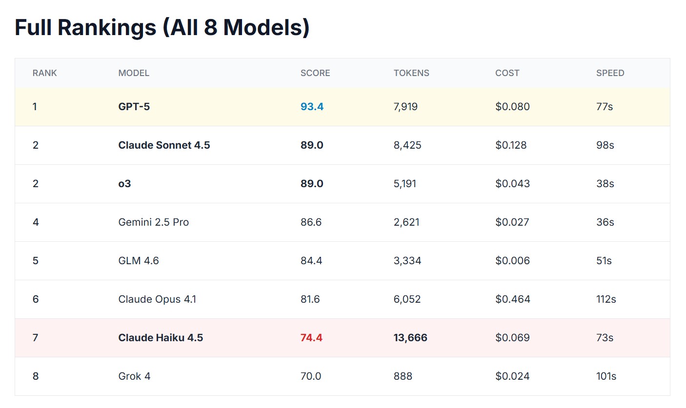 Лідером тестів виявилась модель GPT-5 (94,6). На другому місці — Claude Sonnet 4.5 та o3 (обидві по 89 балів). Далі йдуть: Gemini 2.5 Pro (86,6), GLM 4.6 (84,4), Claude Opus 4.1 (81,6), Claude Haiku 4.5 (74,4). На останньому місці — Grok 4 (70).