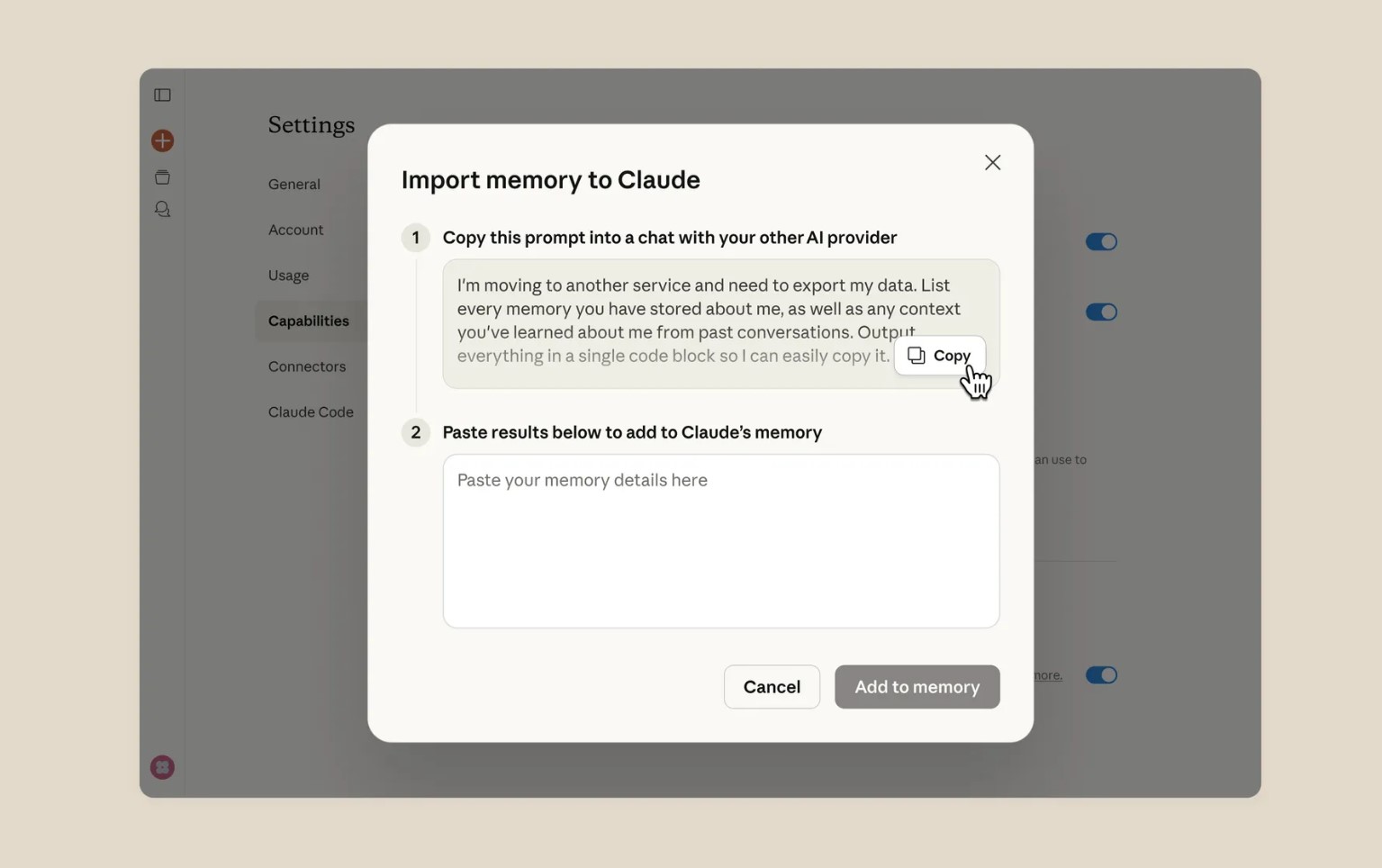 Вбудована функція, яка вже доступна в усіх платних тарифах Claude, після імпорту продовжує роботу без повторного навчання ШІ-асистента. Процедура копіювання займає менше хвилини та гарантує збереження всіх важливих деталей минулих взаємодій.