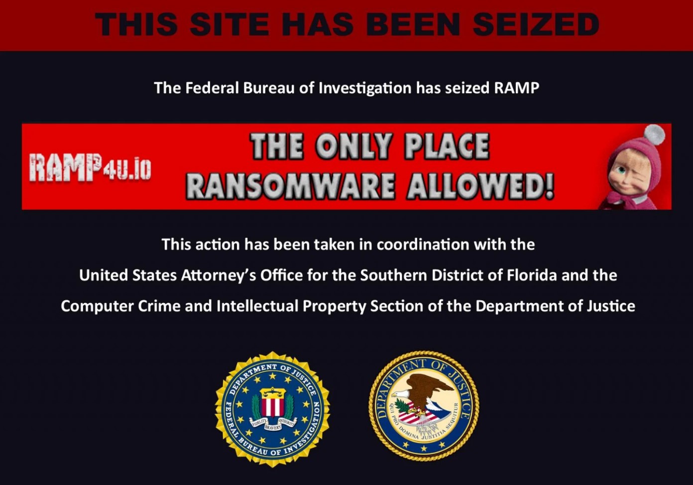 Як на сайті форуму в мережі Тор, так і на його веб-домені ramp4u[.]io, тепер відображається повідомлення: “The Federal Bureau of Investigation has seized RAMP” (Федеральне бюро розслідувань вилучило RAMP).