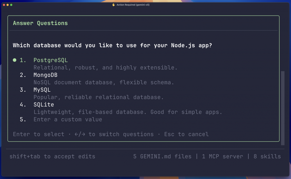 Замість того, щоб робити припущення чи здогадуватися про ваші наміри, Gemini CLI запропонує вам варіанти, запитає роз’яснення щодо конкретного архітектурного вибору або захоче уточнити розташування прихованого файлу конфігурації. Такий двонаправлений інтерактивний зв’язок гарантує, що остаточний план ідеально відповідає вашому баченню, перш ніж ви практичну роботу.