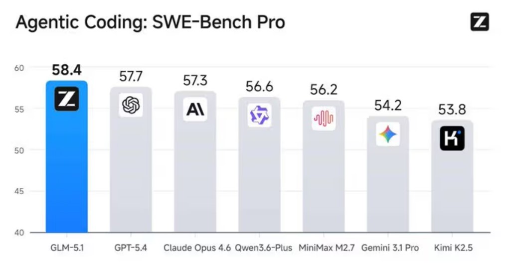 У бенчмарку SWE-Bench Pro, який оцінює здатність моделі вирішувати реальні проблеми GitHub за допомогою запиту інструкцій та контекстного вікна з 200 000 токенів, GLM-5.1 досяг балу 58,4. Щодо контексту, це перевершує GPT-5.4 з 57,7, Claude Opus 4.6 з 57,3 та Gemini 3.1 Pro з 54,2 .