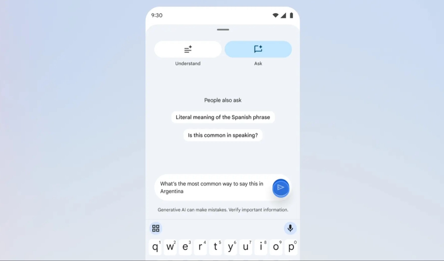 У мобільному додатку Translate з’явилися дві нові вкладки, де можна попросити Gemini надати більше інформації про вираз, який вам потрібно перекласти. Також там можна поставити додаткові запитання до штучного інтелекту. Наприклад, після введення фрази для перекладу ви можете натиснути вкладку «Розуміти», і Gemini розповість вам усе, що вам потрібно про неї знати.