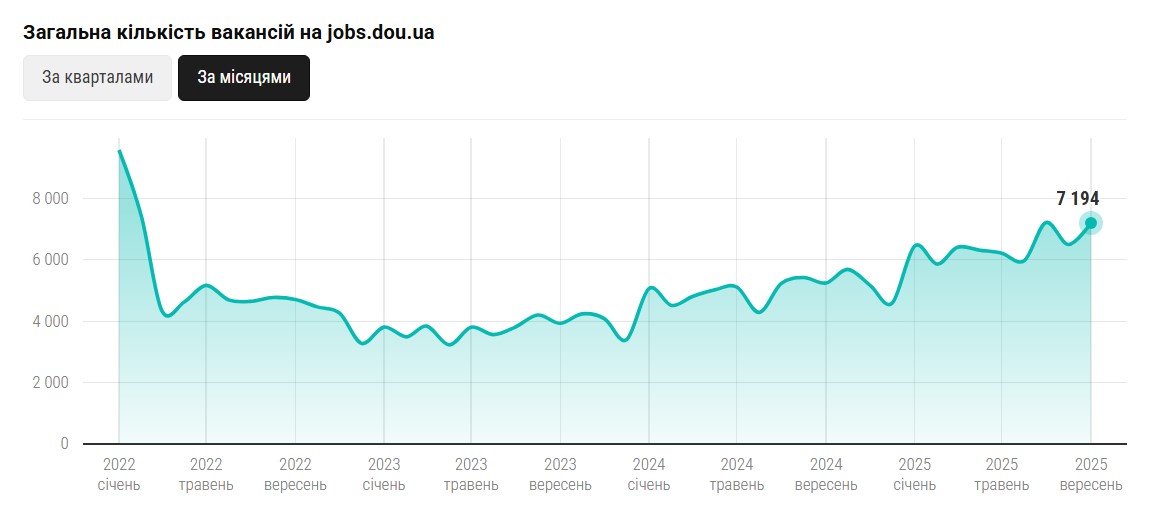 У помісячній статистиці рекордним став липень, коли роботодавці розмістили 7210 IT-вакансій. У вересні цього року було опубліковано майже стільки ж оголошень про пошук персоналу — 7194.