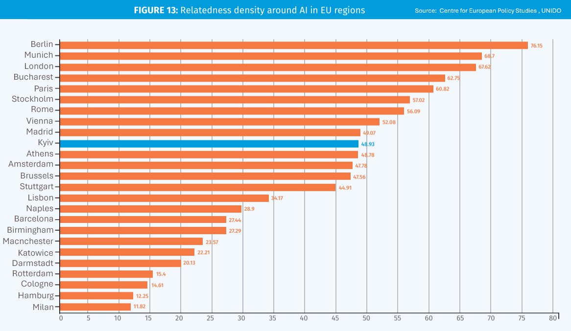 Показник Києва у категорії relatedness density становить 48,9%. Це означає, що майже половина технологій, розвинених у місті, потенційно пов’язані зі штучним інтелектом.