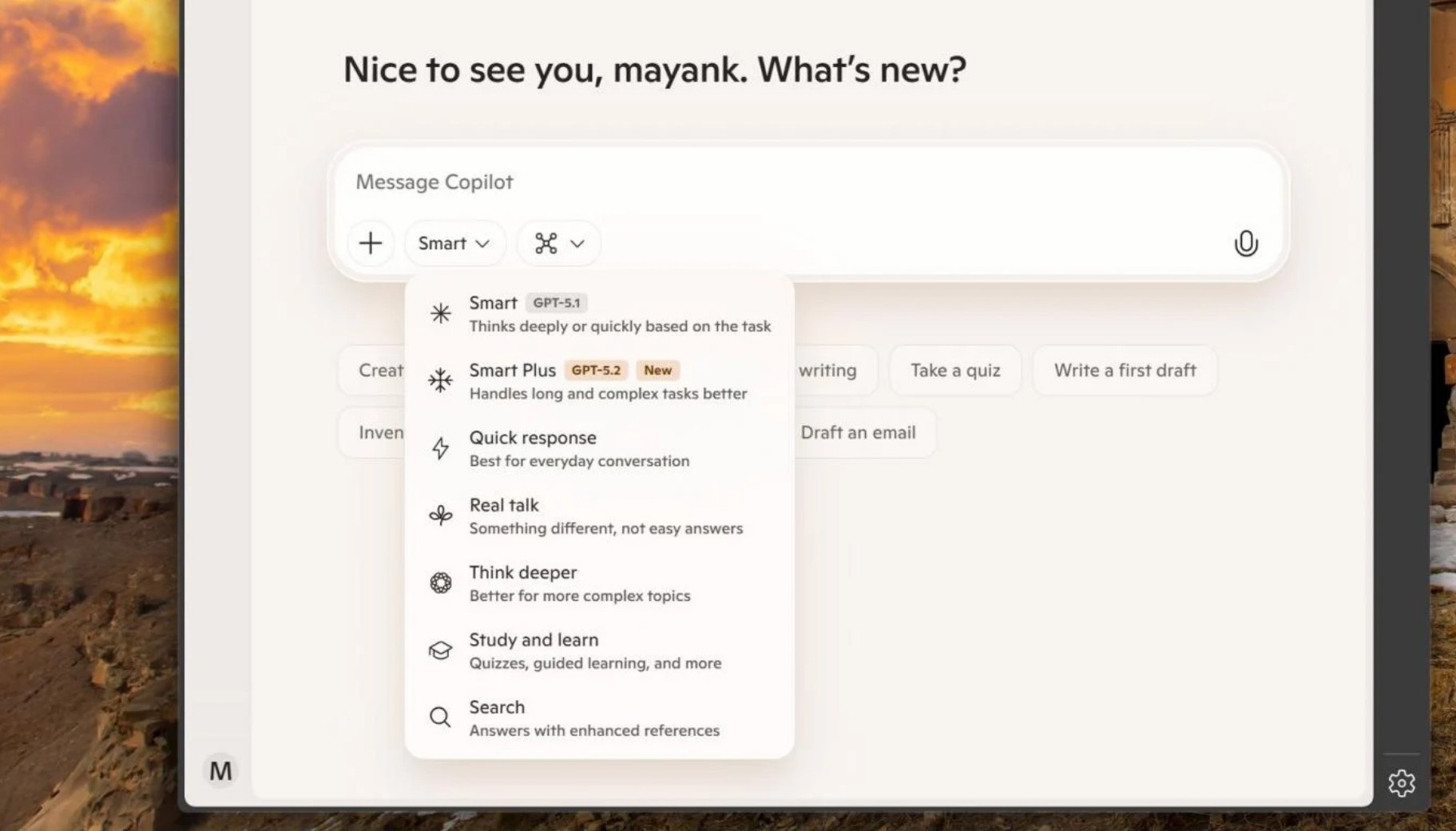 Минулого місяця Copilot було оновлено до GPT-5.1 для режиму Smart. Тепер Microsoft додає GPT-5.2 у Copilot як новий режим Smart Plus. Очевидно, що GPT 5.2 Copilot є варіантом GPT-5.2, орієнтованим на міркування, оскільки Microsoft підкреслила, що він краще справляється зі складними завданнями.