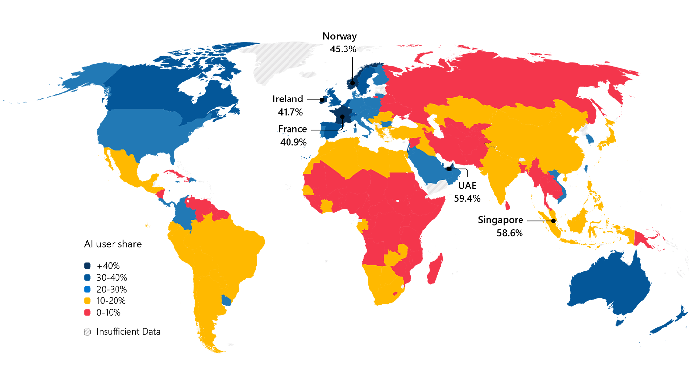 Лідерами за рівнем використання ШІ є: ОАЕ (59,4%), Сінгапур (58,6%), Норвегія (45,3%) та Ірландія (41,7%). Цей список доводить, що доступ до технологій, освіти та сприятлива політика пришвидшує впровадження штучного інтелекту навіть без розробки LLM-моделей або наявності великих центрів обробки даних.
