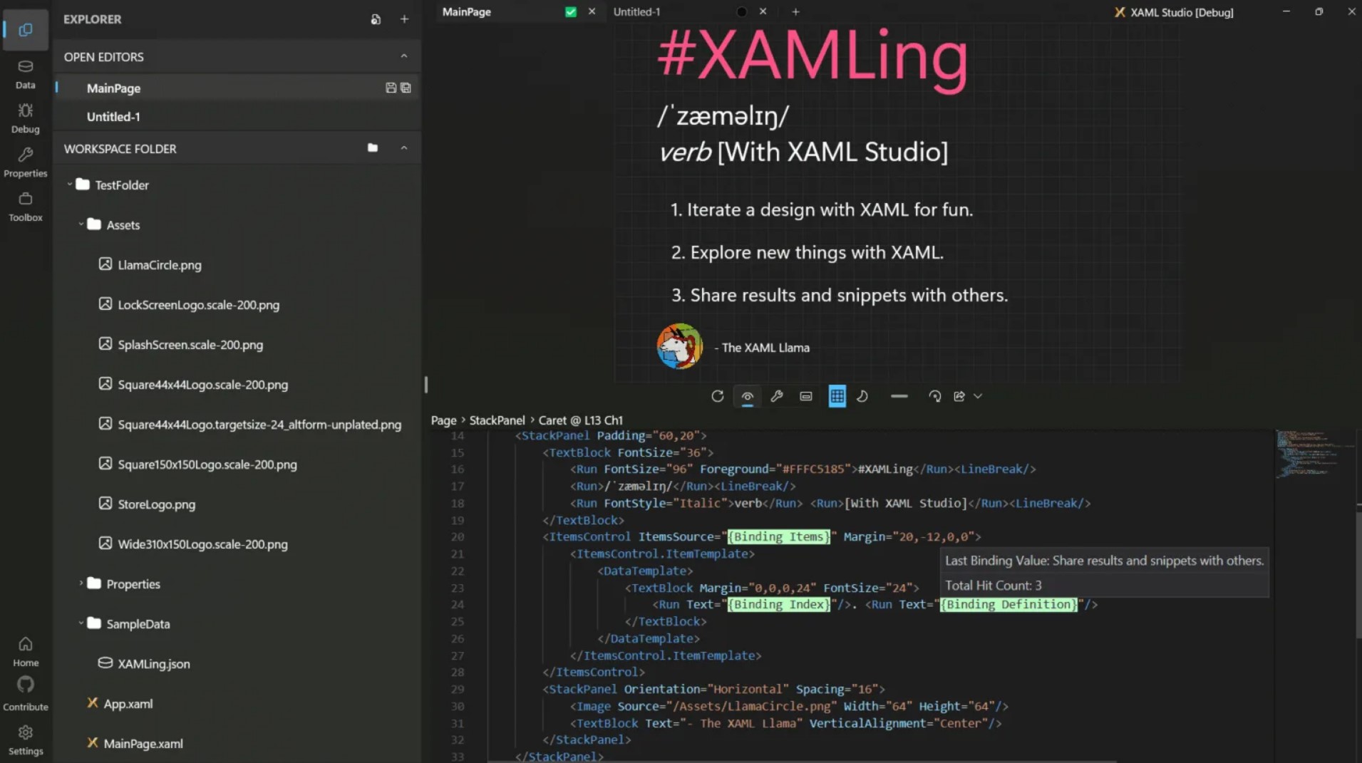XAML Studio включає інтерактивний редактор коду, який дозволяє швидко створювати інтерфейс, оцінювати його зміни після редагування XAML-коду і взаємодіяти з додатком, що розробляється, як з окремо запущеною програмою. До складу XAML Studio також входить налагоджувач і редактор для прив’язки даних.
