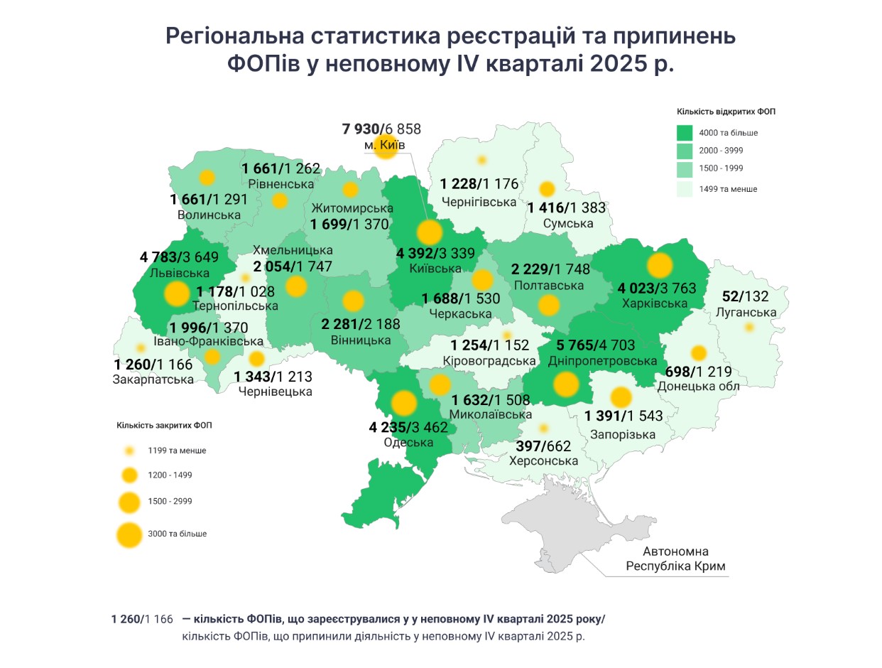 Загалом по країні в 4-му кварталі 2025 року зареєстровано 58,2 тисяч нових ФОП – на 40% більше, ніж в аналогічному періоді 2024-го. Це один з найвищих квартальних показників за останні роки. Припинень діяльності ФОП за цей же період на 18% менше, ніж за той же період минулого року.
