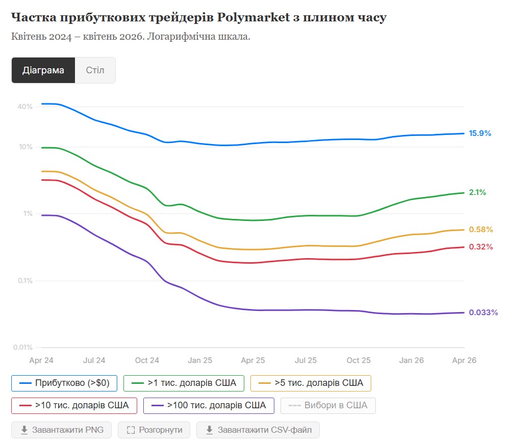 Зниження відсотка прибуткових трейдерів (з 44% у 2024 році до 16% у 2026-му) пов’язують з масовим притоком недосвідчених користувачів під час виборчого хайпу 2024 року. Новачки часто торгують на емоціях, ігнорують управління капіталом (bankroll management) та сприймають платформу як казино.