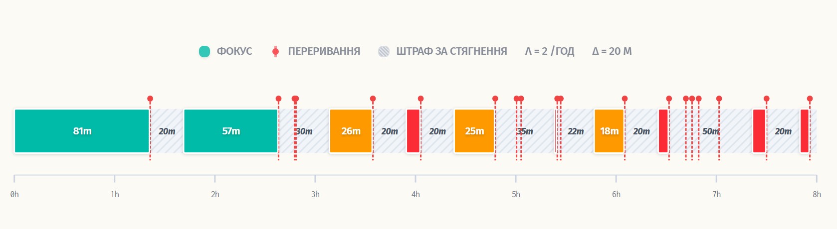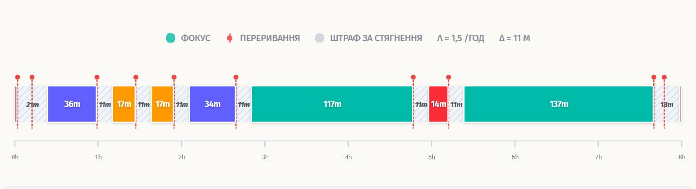 Модель Ліндермана показала, що невеликі зміни дають потужний ефект. Виявилося, що варто зменшити частоту відволікань всього на одиницю на годину і день починає заповнюватися довгими зеленими періодами справжньої роботи.