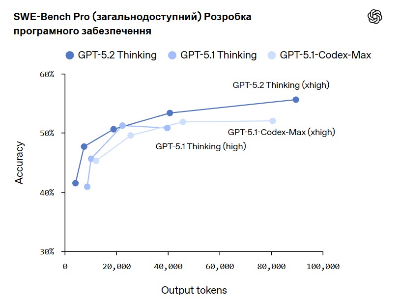 У кодуванні GPT-5.2 Thinking набирає 55,6% у бенчмарку SWE-Bench Pro та 80% у SWE-Bench Verified, що вище, ніж у GPT-5.1-Codex-Max.