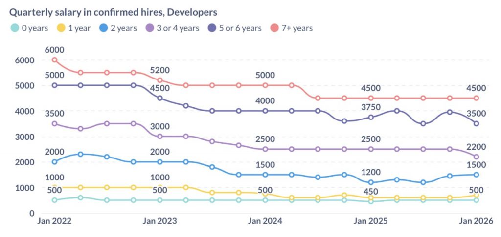 - 7+ років досвіду (зараз це найбільша група серед кандидатів) — $4500. Стабільно з кінця 2024 року.