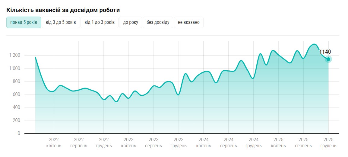 Спостерігається зростання вакансій для початківців: 210 — в грудні 2025 року (118 — в грудні 2024). У 2022 році для джунів без досвіду було лише 40-60 вакансій щомісяця.
