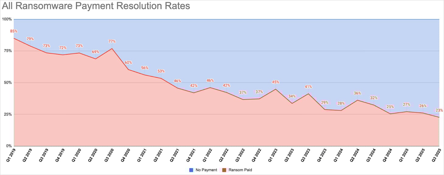 У першому кварталі 2024 року відсоток випадків, коли жертви комп’ютерного зламу сплачували викуп за викрадені або зашифровані дані становив 28%. Протягом останнього часу ця цифра продовжувала знижуватися, досягнувши історичного мінімуму в третьому кварталі 2025 року.