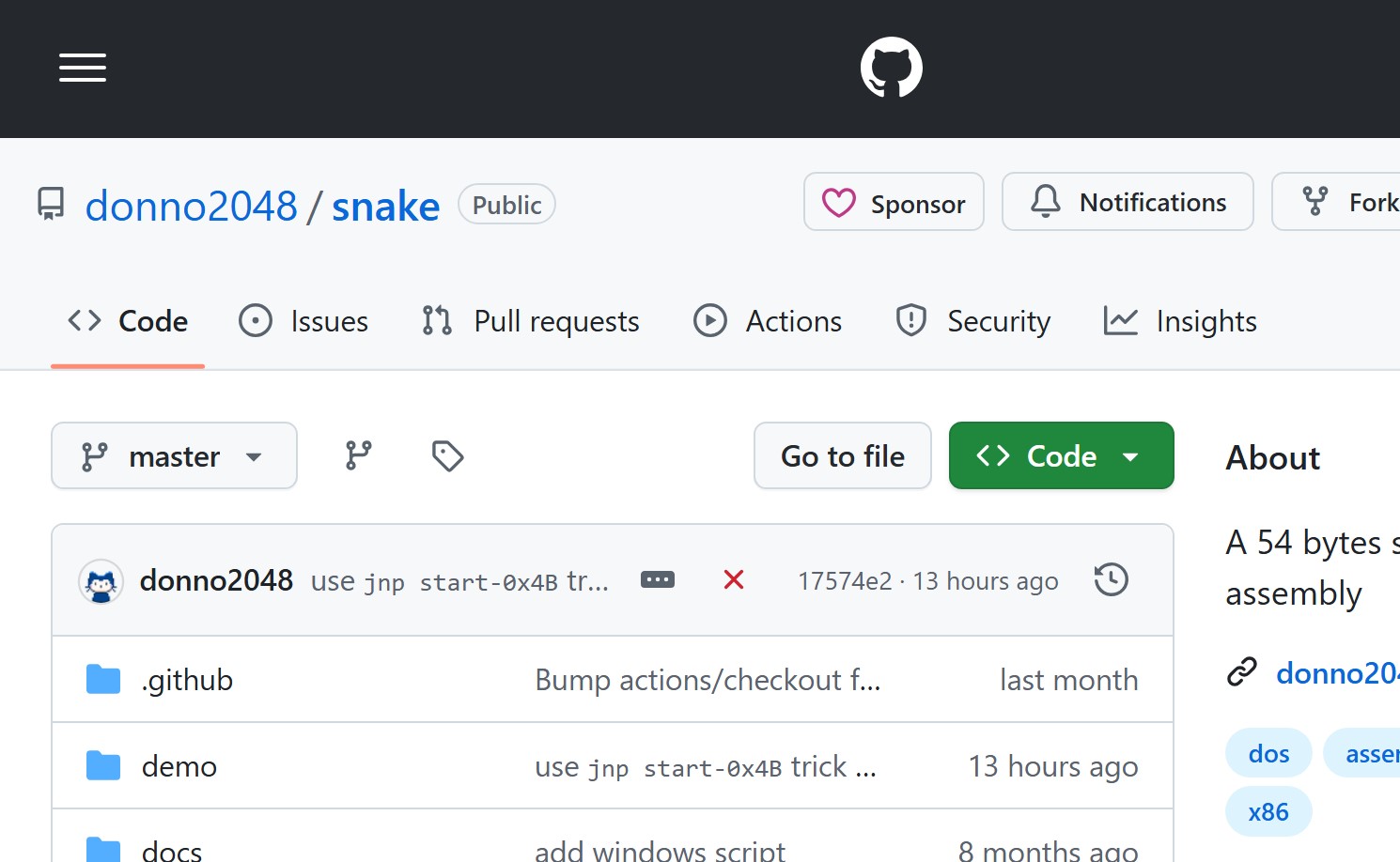 Розробник під ніком donno2048 знову побив власний рекорд, зумівши помістити легендарну онлайн-гру «Змійка» (Snake) в 54 байти машинного коду, написаного на Асемблері. Це настільки мало, що тепер увесь код вміщується в один QR-код.