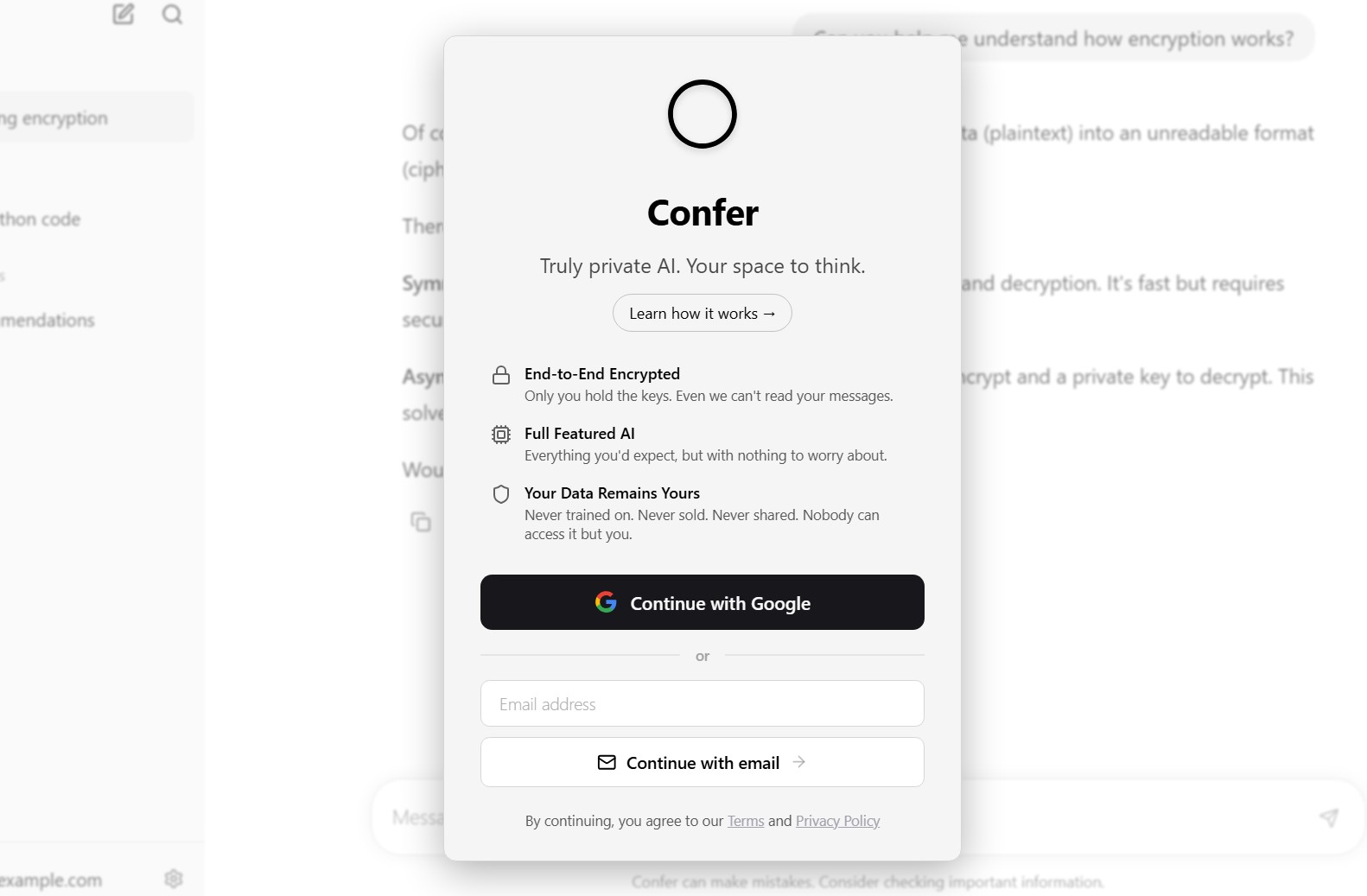 Дані та запити користувача, а також відповіді від LLM, шифруються в довіреному середовищі виконання (TEE), яке унеможливлює навіть адміністраторам сервера переглядати їх або втручатися іншим чином. Ключ від зашифрованих розмов з Confer зберігається на пристроях користувача.