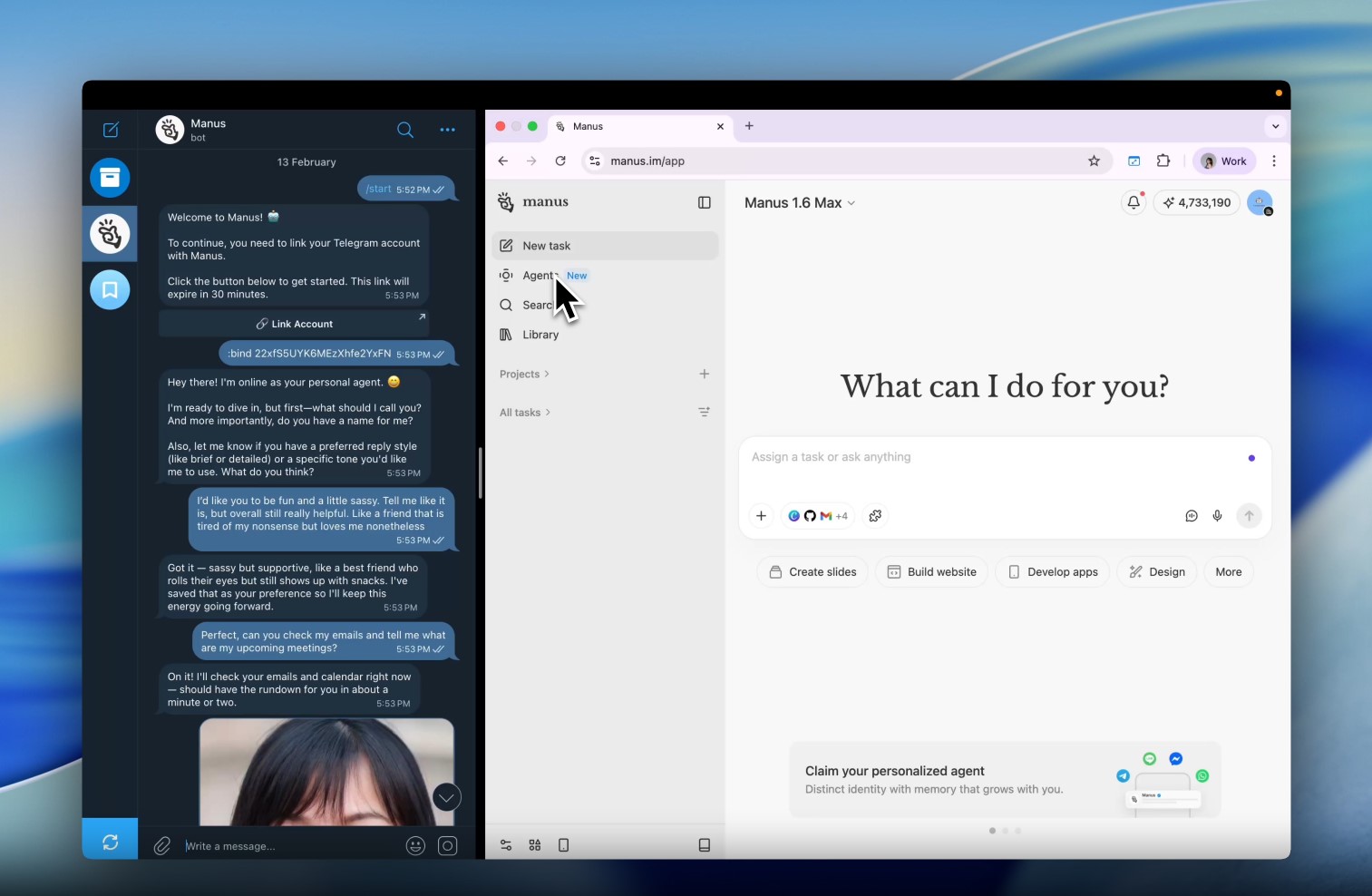 У Telegram можна обирати між двома моделями: Manus 1.6 Max для складних завдань та Manus 1.6 Lite для швидких запитів. Агент не має доступу до інших ваших чатів у месенджері.