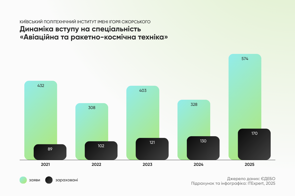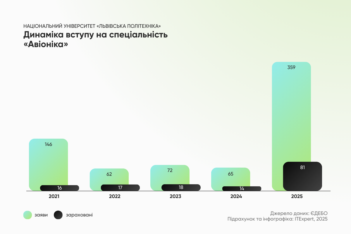 - У 2025 році кількість заяв на ключові MilTech-напрями в КПІ ім. Ігоря Сікорського та Львівській Політехніці зросла від +23% до +82%. Найбільший приріст показують напрями «Авіоніка» (Львівська Політехніка) та «Авіаційна та ракетно-космічна техніка» (КПІ). Хоч темпи зростання помітні, вони не повернулися до довоєнних рівнів, коли потреба ринку у нішевих фахівцях була не такою високою.