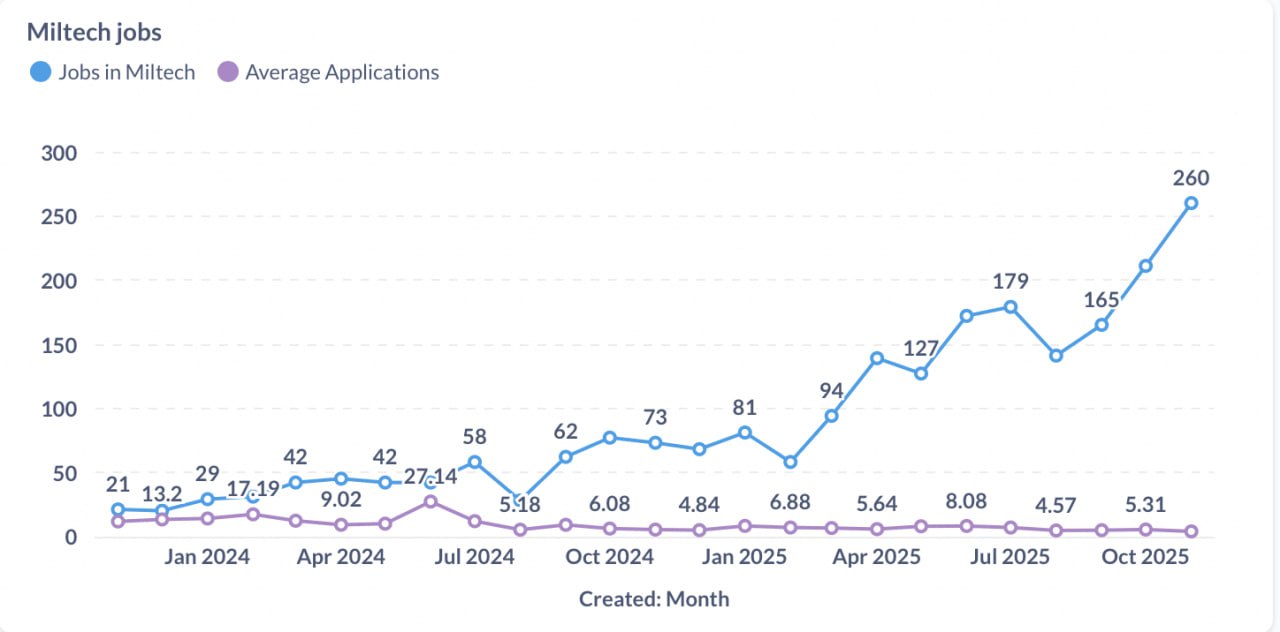 За останній квартал в Україні вдвічі збільшилась кількість miltech-вакансій. Зараз на Djinni розміщено 360 вакансій за цим фільтром, що практично в 2 рази більше, ніж три місяці тому і майже в 5 разів більше, ніж у грудні 2024 року. При цьому середня цифра відгуків зменшується (хоча там часто дуже серйозні вимоги).