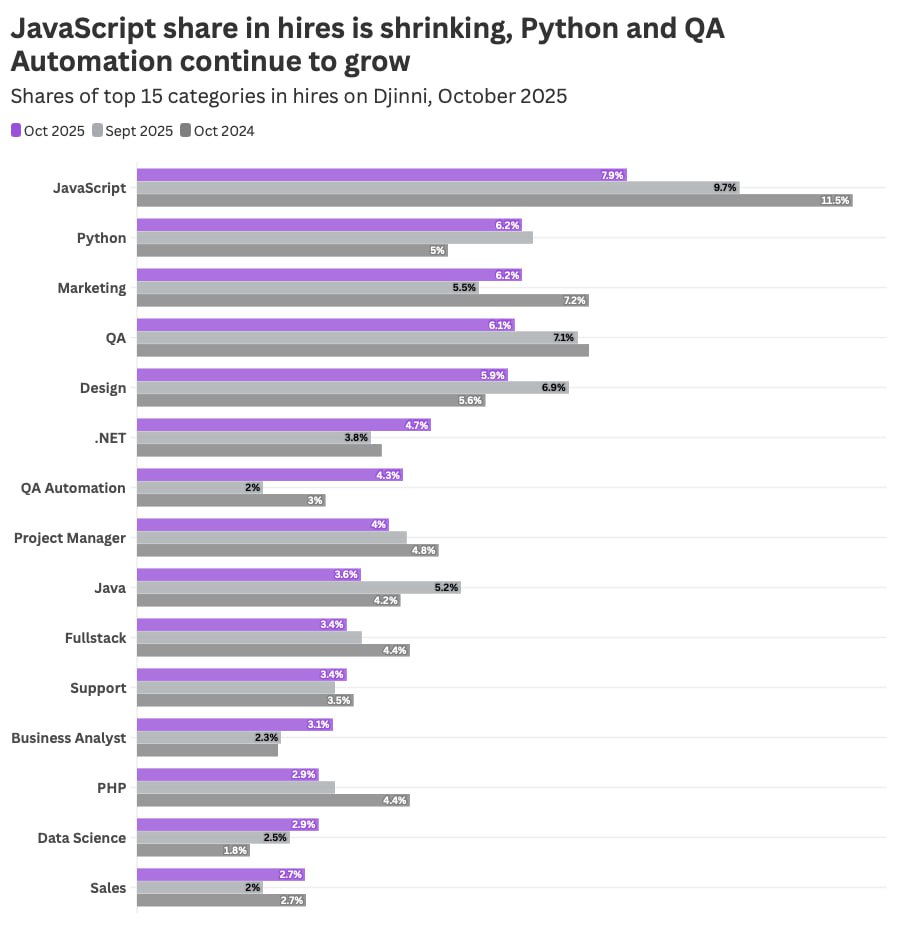 - JavaScript — 8% наймів, їх частка продовжує знижуватись
