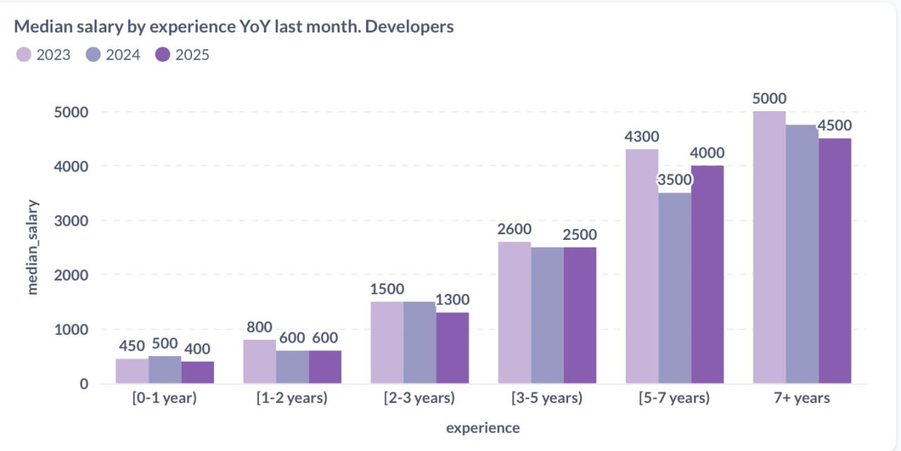 В категоріях мідлів стостерігається стабільність для фахівців з досвідом 3-4 роки ($2500) та зниження для більш молодих розробників. Якщо в 2023 році досвід комерційної розробки давав сподівання на зарплату в $1500, то тепер — лише $1300. Рік досвіду або його відсутність гарантують лише $400-600 щомісяця. Два роки тому джун з 1 роком досвіду отримував у середньому $800.